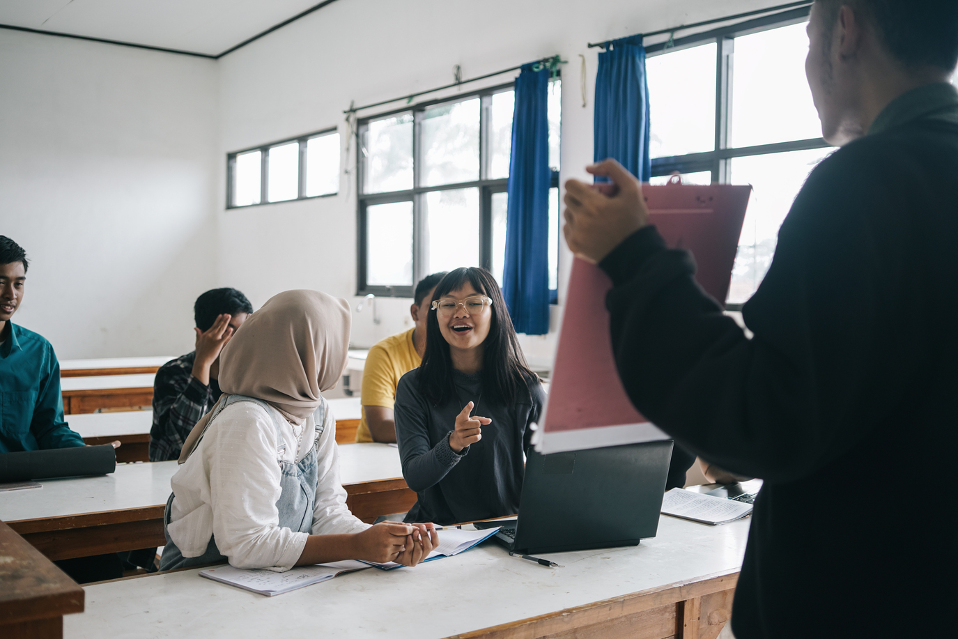 Ruang kelas yang nyaman dan modern dengan fasilitas yang lengkap seperti proyektor, whiteboard, dan AC.